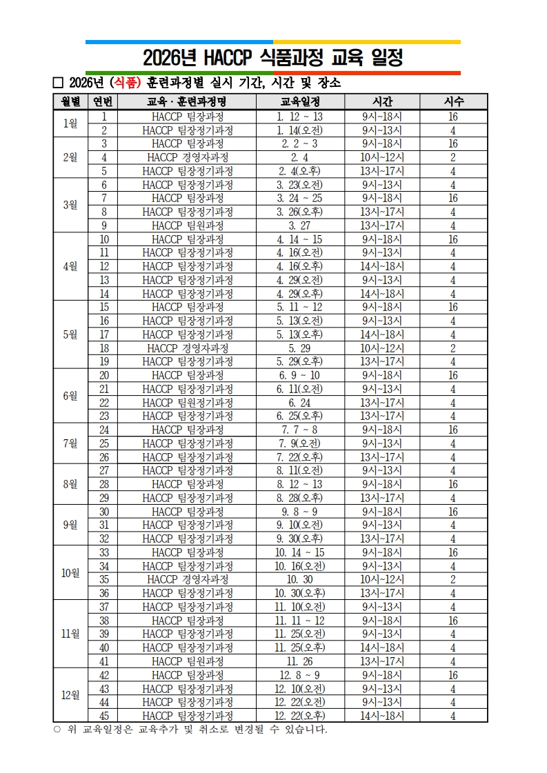 2026년도 식품 HACCP 교육 연간 일정표를 공지하오니 교육 신청에 참고하여 주시기 바랍니다.